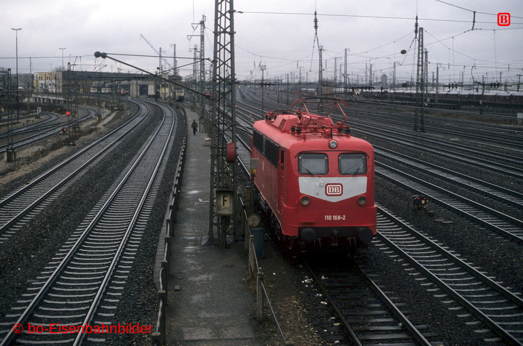 110 168 (E3 MF 21.12.1990) am 30.12.1990 an der Donnersberger Brücke in München.
