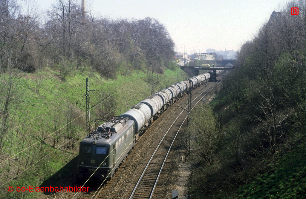 140 006 am 23.04.1987 um 10:51 Uhr mit Kesselwagenzug auf dem Münchner Südring am Giesinger Berg.
